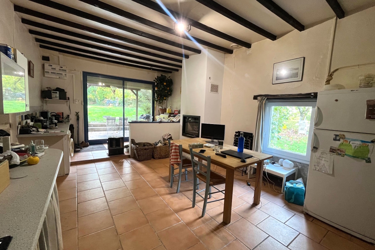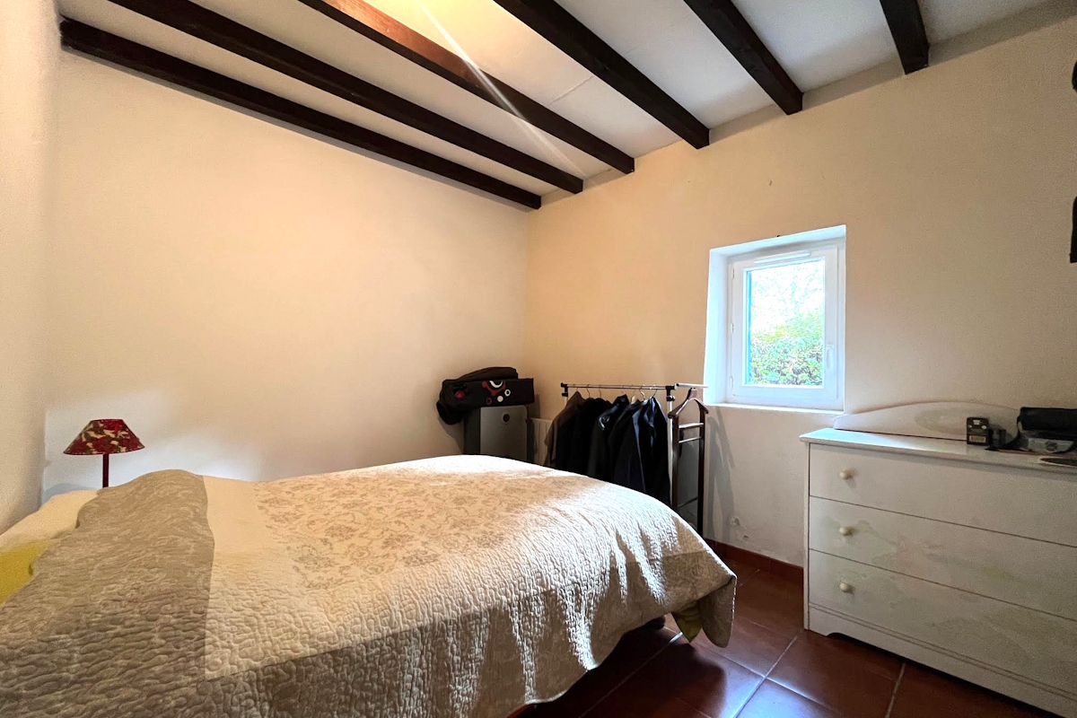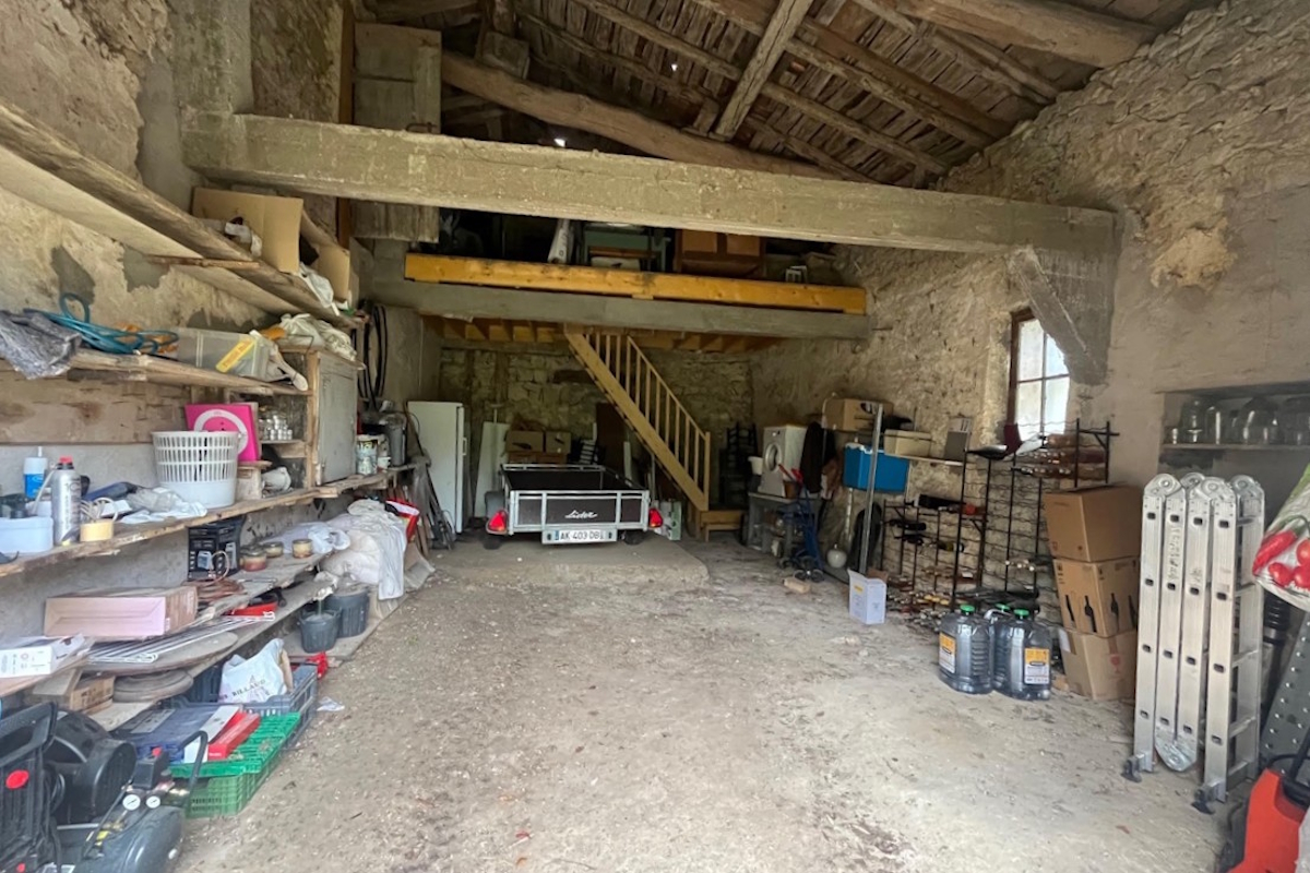 The single-storey stone house, built in 1860, offers around 120 m² of living space and includes: a large kitchen, living room, lounge, two bedrooms, bathroom, WC, storage areas, and an enclosed barn of approximately 45 m² with mezzanine.